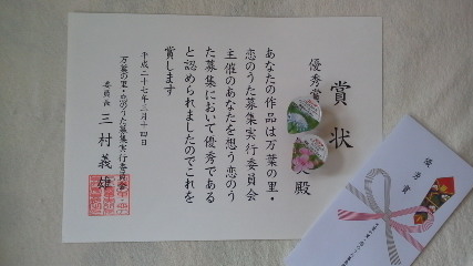 万葉の里・恋のうた募集「あなたを想う恋のうた」で優秀賞をいただきました。