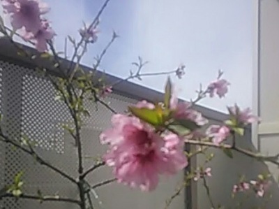 ベランダの桃の花が咲きました。今年はいっぱい咲いてうれしいです。桃の実は昨年6,7年目にしてやっと一つ育ちました。今年は昨年より花の数が多いから、もっと生ればいいなと心が弾みます。